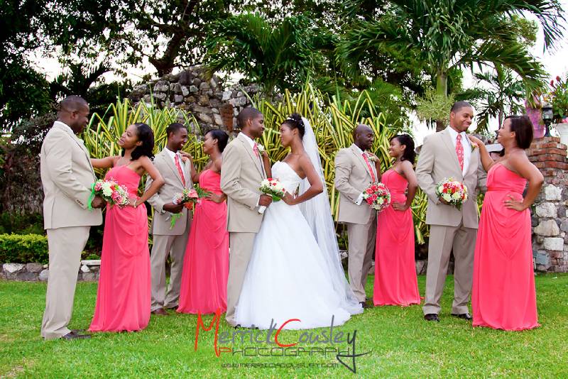 The groom was dapper in a beige, pin-striped Calvin Klein suit accentuated by an exotic guava tie and complemented with footwear from Aldo Classic. His groomsmen and best man were similarly styled while the three bridesmaids and matron of honour were perfectly gowned in guava, strapless, chiffon A-line dresses with draped skirt and gold pumps. On the arms of her father, Michael, the bride appeared in a stunning David's Bridal tulle-over-satin ball gown with metallic embroidery, and walked gracefully up the aisle, to the sultry voice of Kadian Northover, to meet her groom.