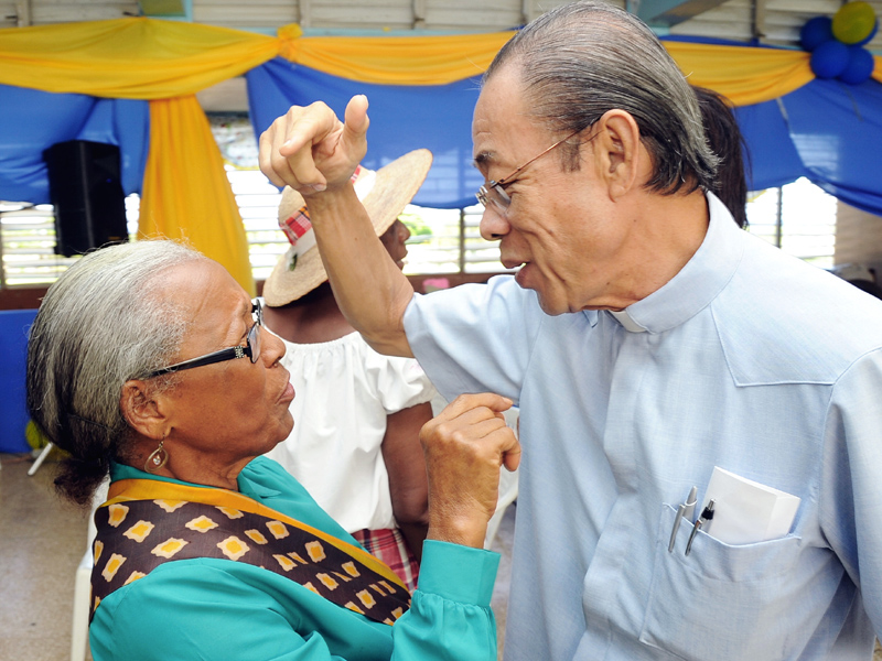 Madge Dunbar chats with the Rev Leslie Hoo Sang after he received his award at the Harbour View Citizens' Association Independence Flag-raising and Awards to mark the 50th anniversary of the community at Harbour View Primary School on Friday, August 6.