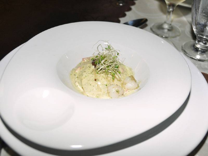 A Bombay mango sorbet was used to cool the palate, making way for an olive oil poached lobster tail, accompanied by carrot rice cake, marinated peaches, and asparagus tips, laced with Cognac cream. The Cognac was not overpowering, the lobster was excellent and the carrot rice cake was proof that the chef's creative juices were flowing.