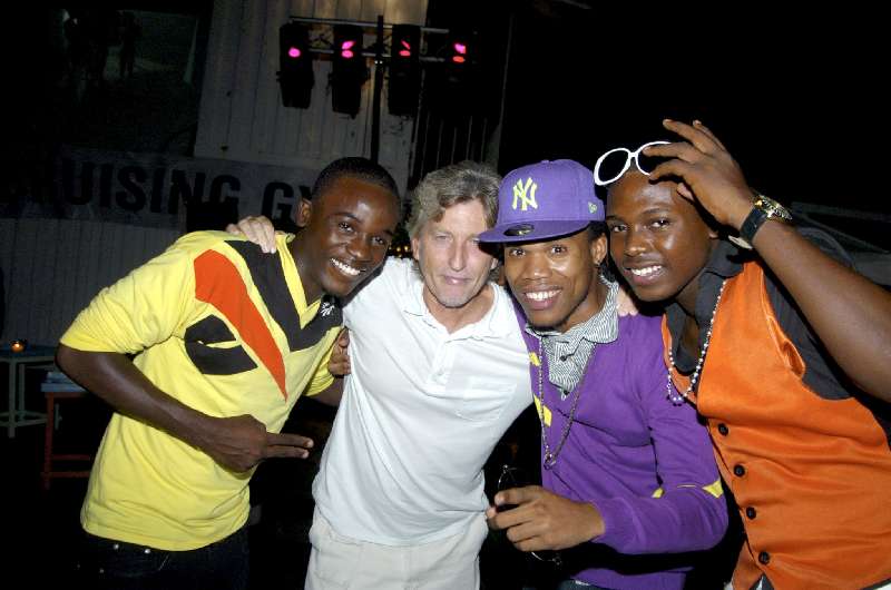 Kevoy Burton (left); Chris Browne (second left), director/ producer; Kadeem Wilson (second right) and O'Daine Clarke are having a grand time. - photos by Winston Sill/Freelance Photographer