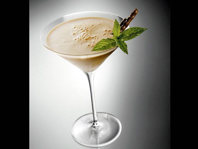 Rim a cocktail (martini) glass with sugar syrup then dip into chocolate flakes or powder. Add ingredients into a shaker with ice. Shake well then strain into the cocktail glass.