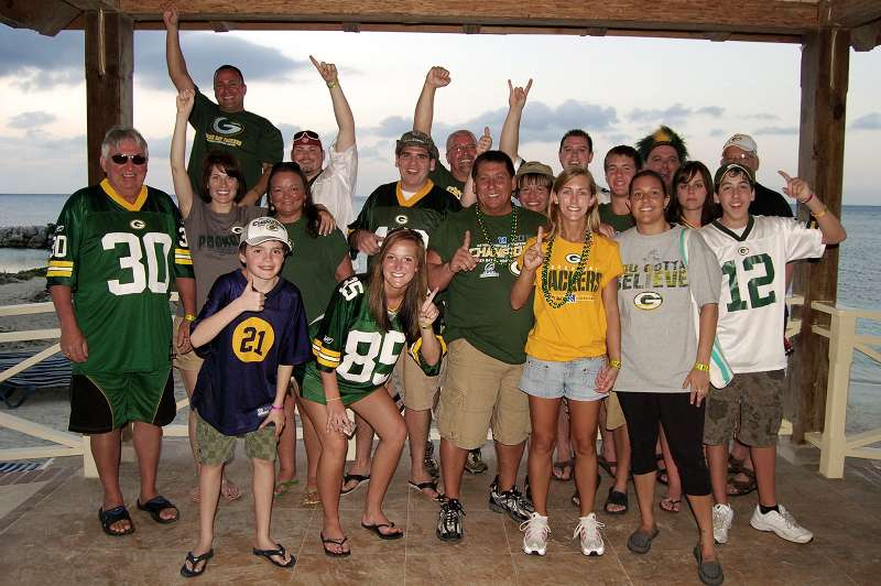Green Bay Packers' fans celebrating, led by Sunset Jamaica Grande Resort's entertainment coordinator Asha Gonzales (in red).