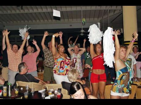 Sunset Jamaica Grande Resort's Eladio Garth (front) and Derron Troupe (second right) celebrate with Green Bay Packers' fans during the Super Bowl party at the hotel on Sunday.