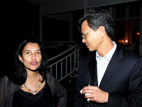 Minh Pham (right), UNDP's resident coordinator in Jamaica, raps with Marsha Montgomery.
