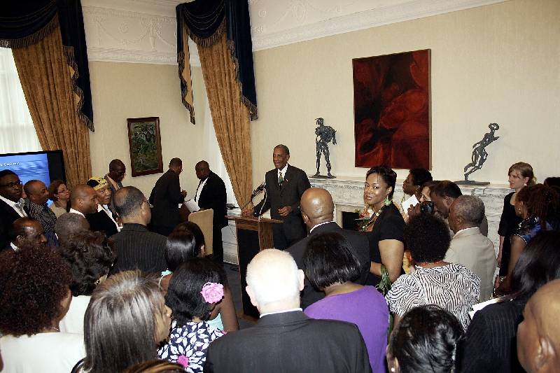 Jamaica's high commissioner to the United Kingdom, Anthony Johnson (at lectern), welcomes guests to a reception to celebrate Jamaica's 49th anniversary of Independence, held on Friday, August 5, at the High Commission's London headquarters. - Contributed
