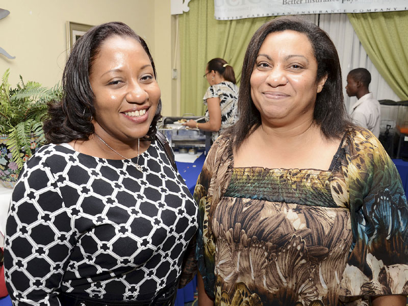 Simonne Goodluck (left) and Anile Wallace pose for Outlook at the official opening and cocktails of the Asso-ciation of Insurance Institutes of Caribbean 14th annual insurance education con-ference for the Caribbean hosted by Insurance Institute of Jamaica at The Knutsford Court Hotel in St Andrew.