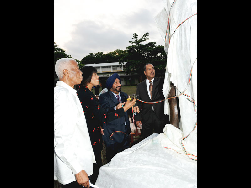 With a few snips of their scissors, Prime Minister Portia Simpson Miller, Minister of Foreign Affairs and Foreign Trade A.J. Nicholson and Indian High Commissioner Mohinder Grover unveiled the statue in a brief ceremony last Thursday.