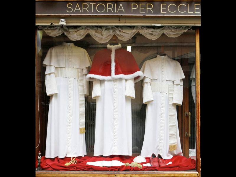 The papal outfits are on display in the window of the small wood-panelled store nestled in the shadow of the Pantheon, where the family moved in 1850 from the original 'bottega' (artisan shop) founded just around the corner in 1798. Before the start of the conclave, the outfits will be delivered to the Vatican and left in a room next to the Sistine Chapel where the newly elected pope changes into his new clothes.
