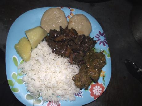 In photo: Yam, dumpling, and white rice served with corned pork with stewed chicken back. Rasbert Turner