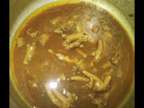 During Food's visit, there was chicken back, hog head, corned pork, salted mackerel 'run dung', curried chicken foot accompanied by dumplings, boiled banana, yam, sweet potato and rice with peas, pumpkin, and callaloo.