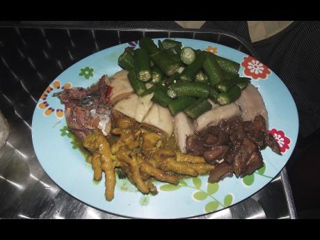 In photo: A dish of salted mackerel, corned pork, chicken foot and okra served with boilded bananas and dumplings.-Rasbert Turner.