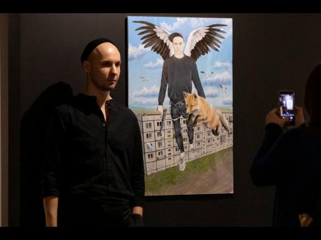 In this photo taken on Saturday, October 26, 2019, self-taught painter Pasmur Rachuiko, who offers an extreme outsider’s view of Moscow reality, poses for a photo prior to opening his exhibition at the Gogol Center in Moscow, Russia.