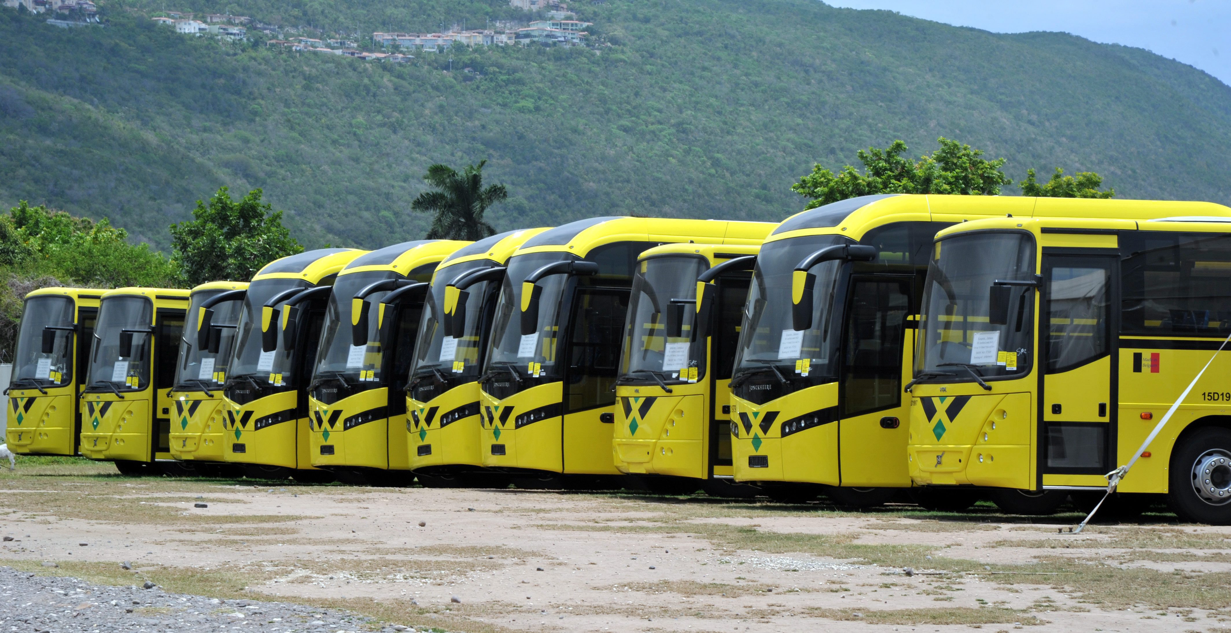 Ten new Jamaica Urban Transit Company buses, that may soon hit the road, parked at an open lot on Lady Musgrave Road in St Andrew.