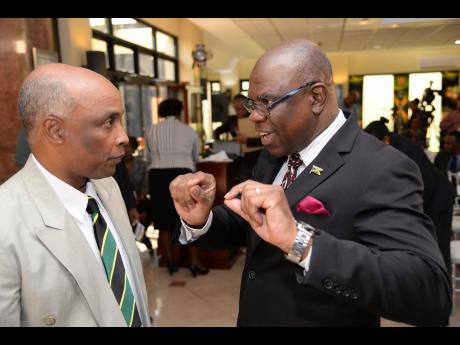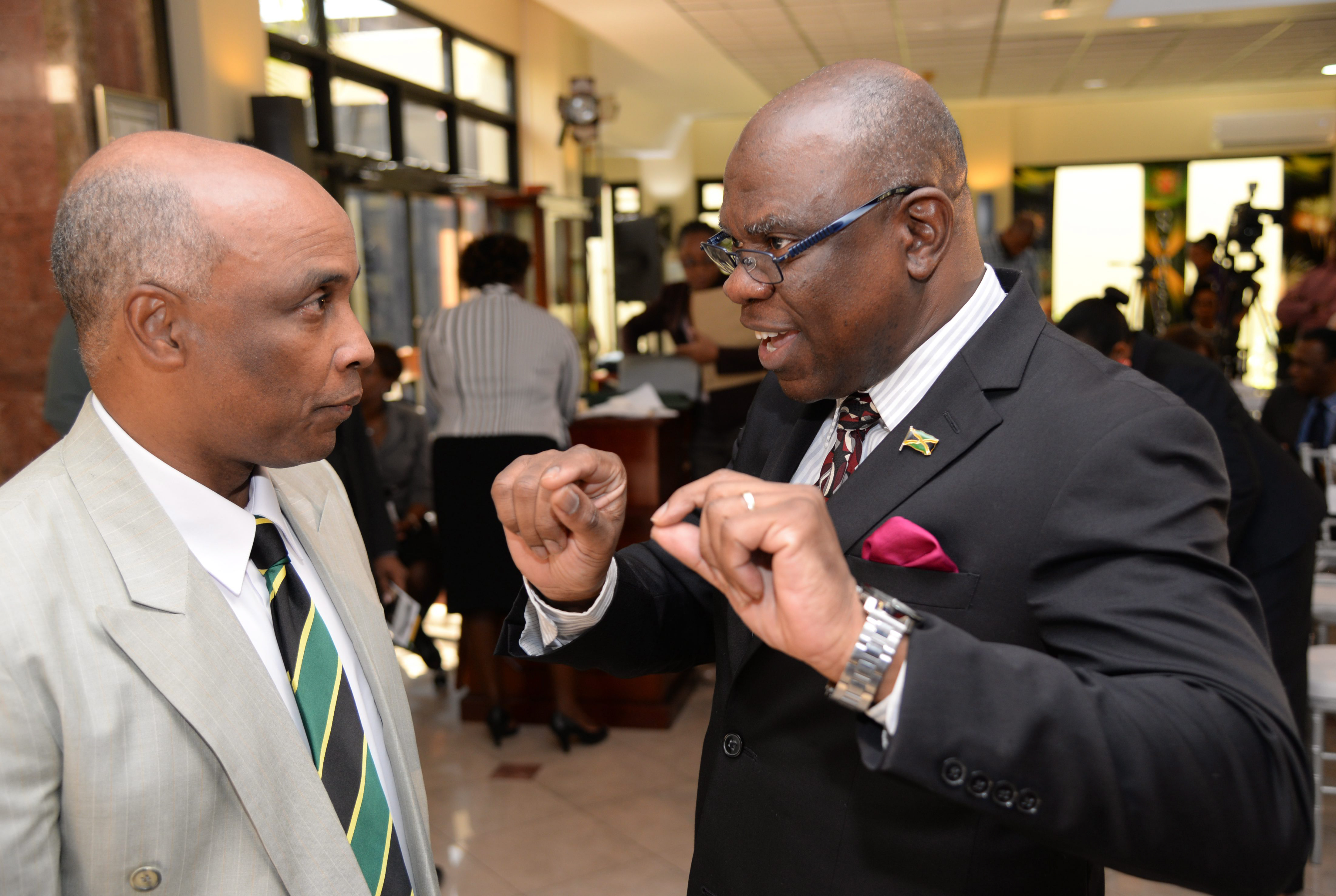 Ian Wilkinson (right) makes a robust argument to Christopher Samuda (left) at the contract signing and press launch of the Jamaican Athletes Insurance Plan at the Office of the Prime Minister on Thursday, January 28, 2016.