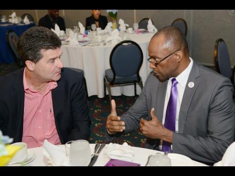 Vice-president of C&W Business Donovan White (right) chats with host William Mahfood at the PSOJ President’s Forum held on January 26, 2016. White was keynote speaker at the event.