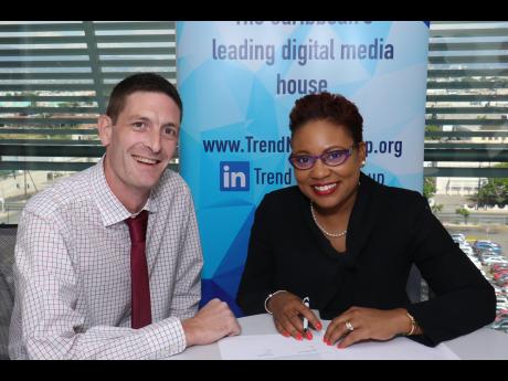 It’s toothy smiles all around as Declan Tully, head of sales at Trend Media Group, and AmCham Jamaica CEO Gail Abrahams sign an agreement for digital sales and marketing campaigns for AmCham members, in Kingston on January 21, 2016.