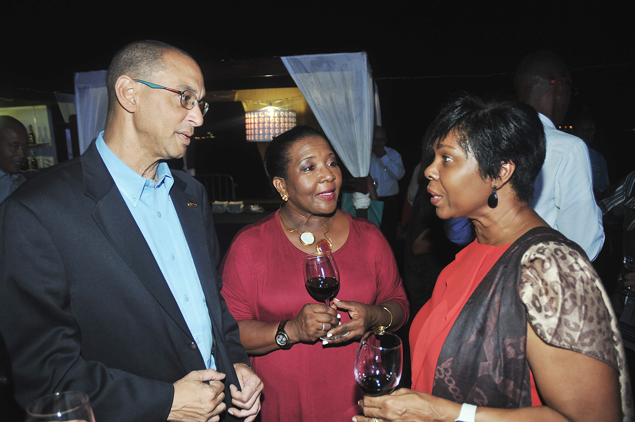 GraceKennedy CEO Don Wehby, wine consultant Marliyn Bennett (centre) and Jacinth Byles (right) at the launch of GK’s newest division Harbour Wines & Spirits on Tuesday, February 2, 2016 on the Kingston waterfront.