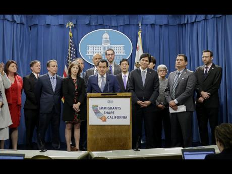 Assembly Speaker Anthony Rendon (centre), D-Paramount, discusses a pair of proposed measures to protect immigrants, during a news conference in Sacramento, California, Monday, December 5. Big business is also warning Trump not to pursue mass deportations.
