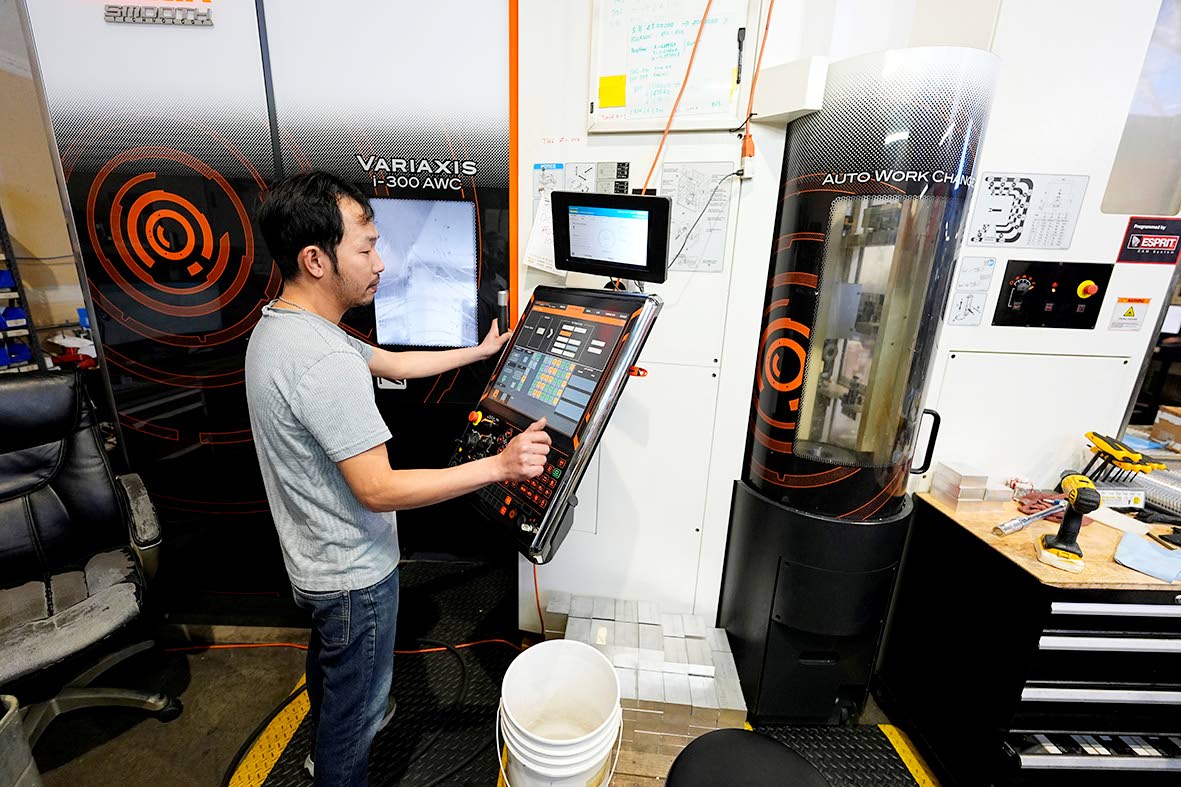 A worker at Reata Engineering and Machine Works programmes a Mazak Variaxis machine used to make semiconductor pieces on Thursday, February 15, in Englewood, Colorado. Reata, which supplies the aviation and medical device industries, has invested heavily i