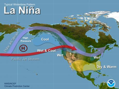 La Niña is a climate pattern that describes the cooling of surface ocean waters along the tropical west coast of South America. La Nina is considered to be the counterpart to El Nino, which is characterized by unusually warm ocean temperatures in the equatorial region of the Pacific Ocean.