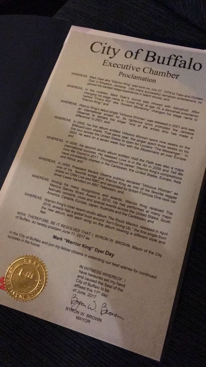 Mayor Brown made the presentation to the singer following his performance at the event hosted at 143 Broadway Avenue. Part of the proclamation to the reggae singer, narrated by the mayor, read: "Among his many recognitions and awards, Warrior King's recent album, The Rootz Warrior, already has a global buzz around Ain't Giving Up ... . Each song on the album bearing a different style and feel. Now, therefore, be it resolved that I, Byron W. Brown, mayor of the city of Buffalo, do hereby proclaim June 11, 2017 as Mark 'Warrior King' Dyer Day."