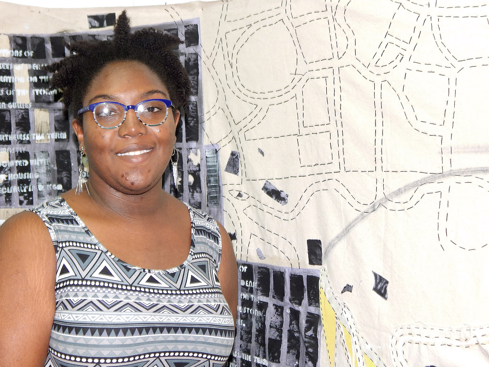 Desanna Watson with pieces from her mixed-media artwork, ‘Retention of a Colonial Past’, in the background.