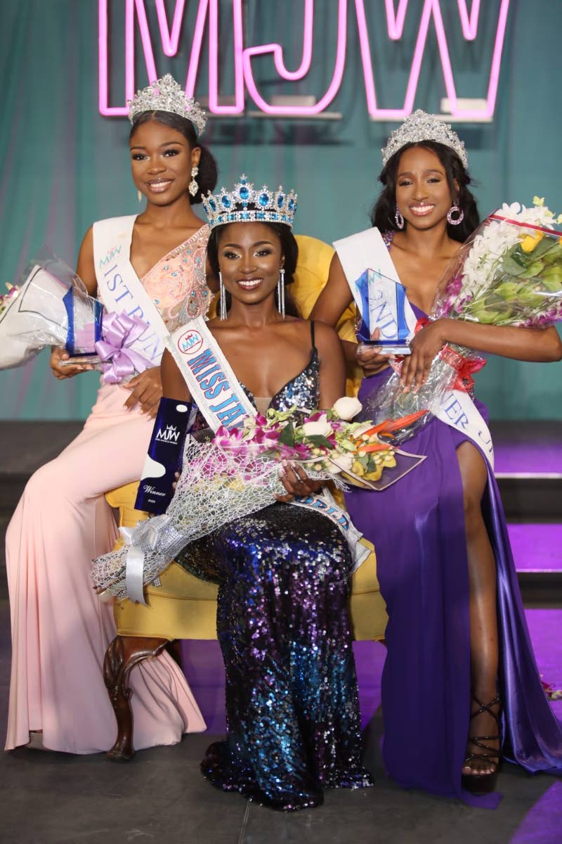 Miss Jamaica World 2024 Tahje Bennett (centre), is flanked by first runner-up Jamila McGowan (left) and Shanelle Kellyman, second runner-up.