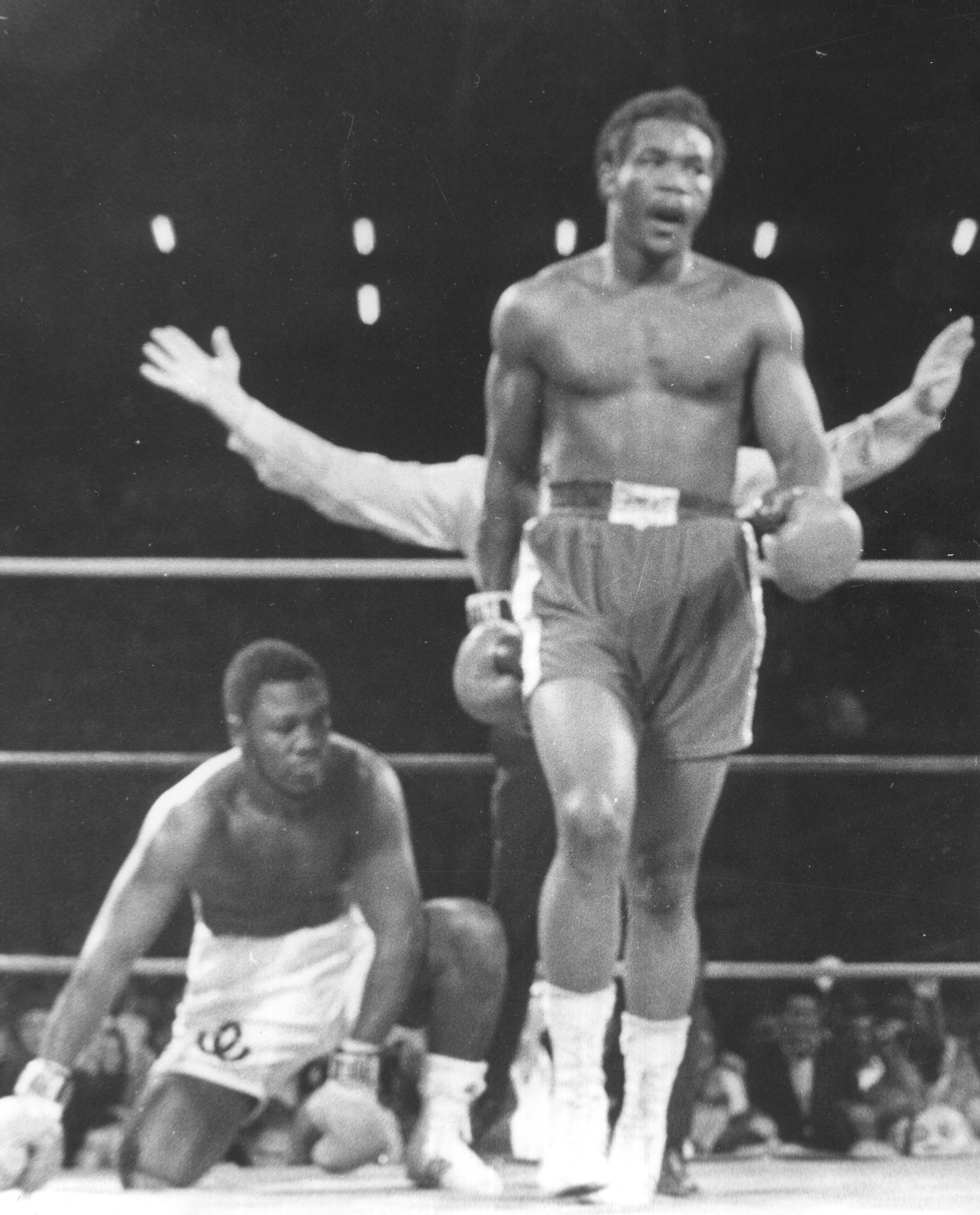 A record boxing crowd of 36,000 saw the 6ft. 3” Texan challenge exploding from the very-first round in which the champion was knocked down three times. Frazier went down three more times in the second round before the referee stopped the contest.
