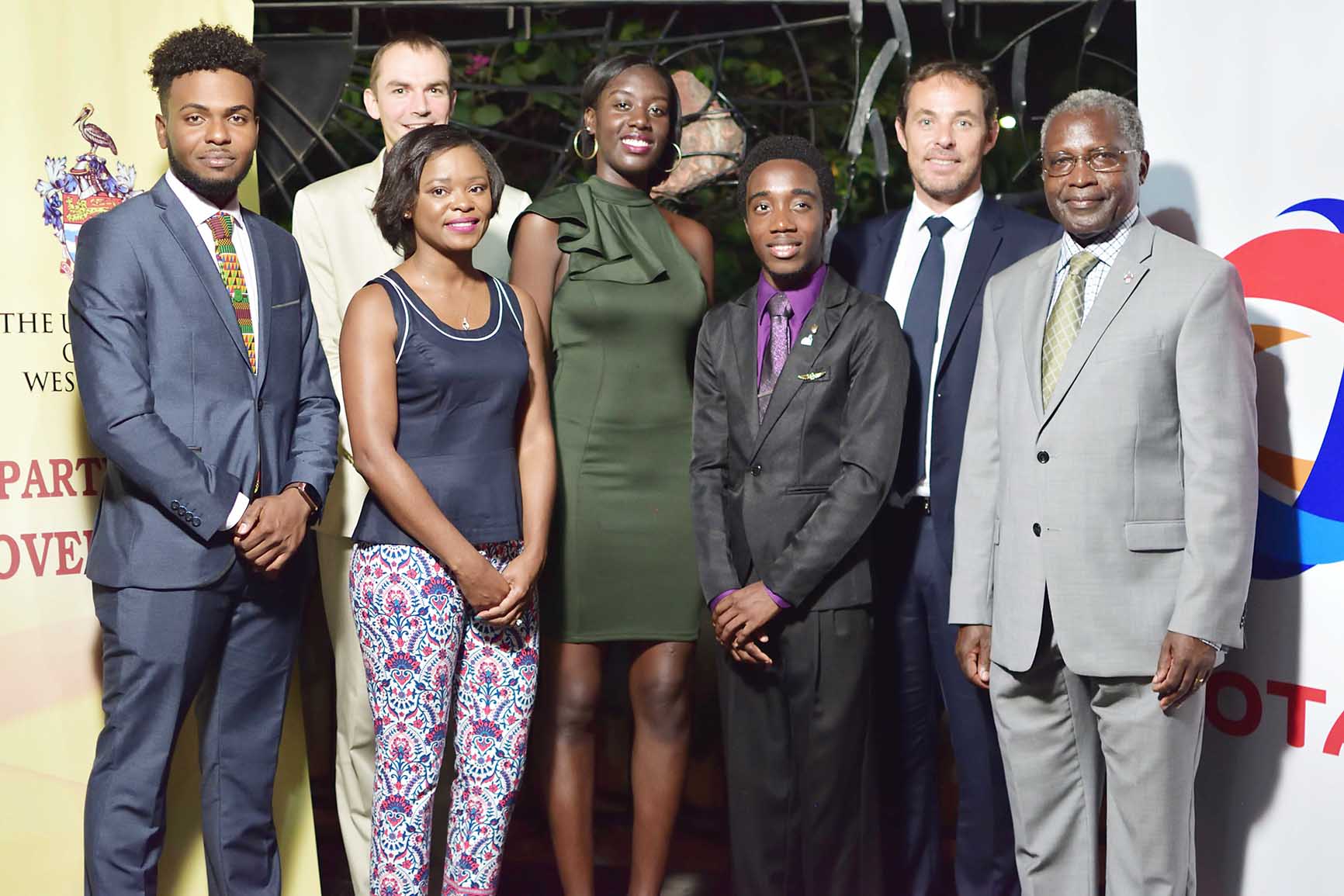 Adieu! Total Jamaica’s Managing Director David Ducognon (second right) is joined by Laurent Geslin (second left, at back), charge d’affaires, French Embassy, in bidding Total Jamaica-University of the West Indies (UWI) scholarship recipients Tafar-I Williams (left, at back), Janique Crosdale (second left, front) and Jevon Dixon (third left, front) all the best on the next leg of their respective journeys towards a five-year master’s degree in political science. Also included in the party are Dr Omar Hawthorne, programme coordinator (left, at front), Department of Government, UWI; and Professor Ishenkumba Kahwa, deputy principal, UWI.
