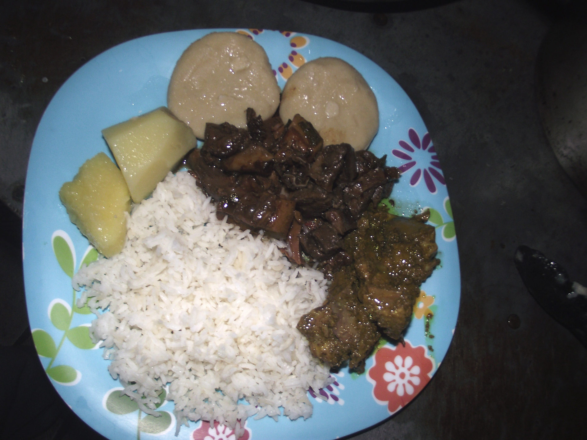 In photo: Yam, dumpling, and white rice served with corned pork with stewed chicken back. Rasbert Turner