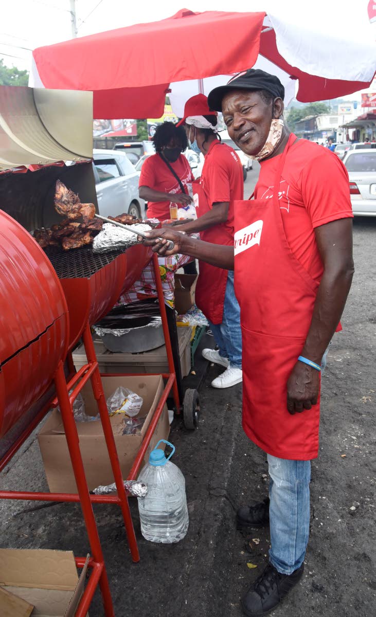 Jerk man Donald ‘Sticky’ Smith preps the breast and wing quarter for a customer at the legendary Shaggy stand.