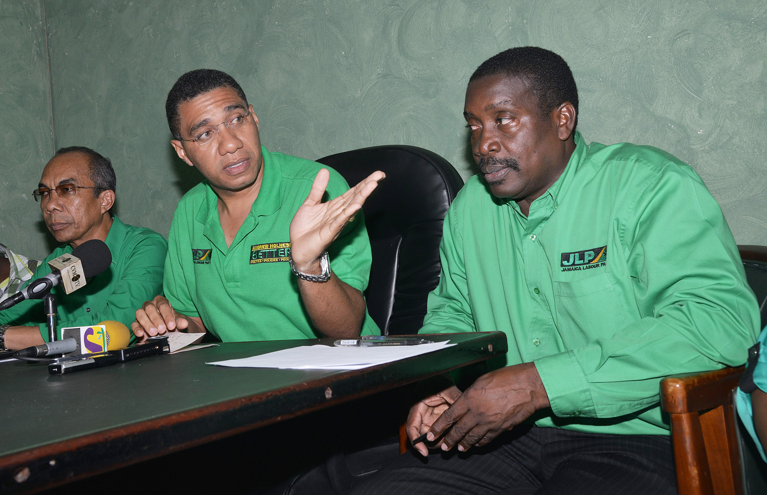 File Jamaica Labour Party leader Andrew Holness (centre) Bobby Montague chairman (right), and Horace Chang, general secretary, during a pres conference at the party head quarters