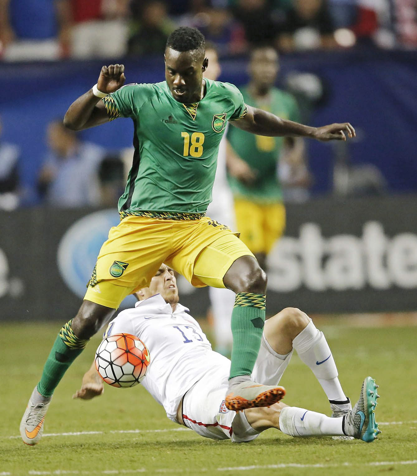 Reggae Boy Simon Dawkins tries to escape an American defender during the semi-final of the 2015 CONCACAF Gold Cup.