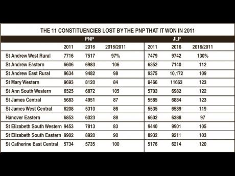 This poor performance, compared to the national JLP average gain of 108%, means the PNP would have won these two seats (and thus retained control of the government by a 33 to 30 margin) if it had managed to get the same number of votes this year as it did in 2011.