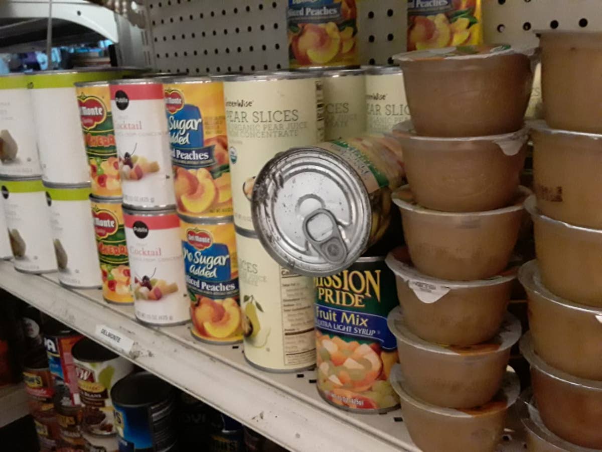 Other shelves inside the store were stacked with dusty fruit packs and canned fruit juices, some of which were dented and orange-brown from rust.