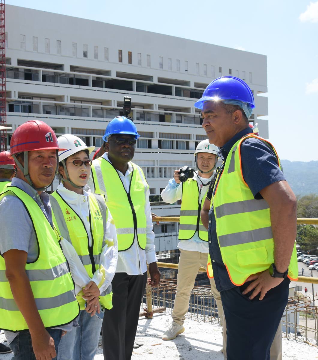 On Friday, Health Minister Dr Christopher Tufton (right) toured the Cornwall Regional Hospital in St James, discussing the ongoing restoration project with (left) Qiu Ye Bo, Fiona Wang and Conrad Pitkin, Custos of St James.