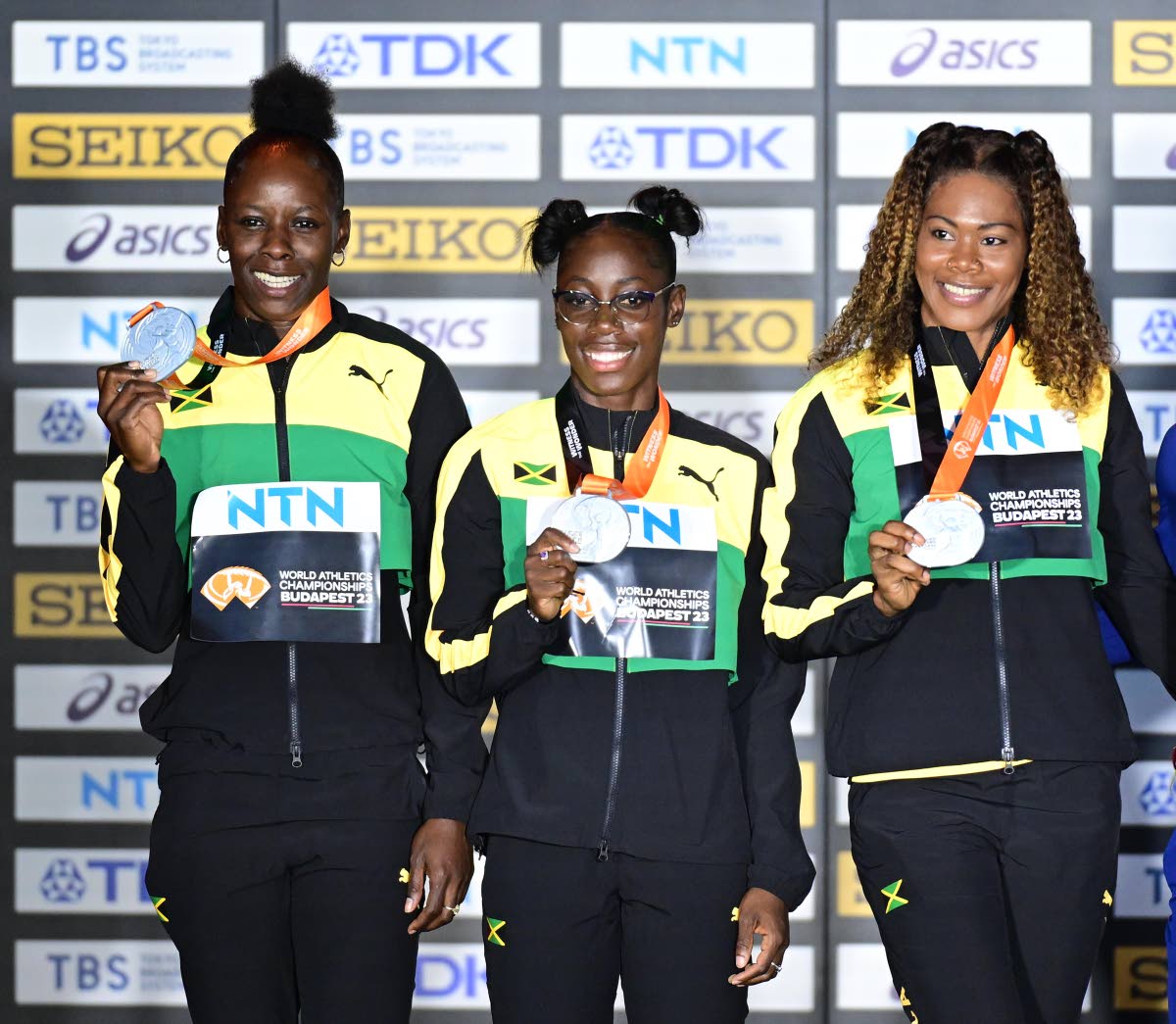 Jamaica’s 4x100m relay team of Shericka Jackson, Shashalee Forbes and Natasha Morrison. Shelly-Ann Fraser-Pryce was absent from the medal ceremony after suffering an injury during the race.