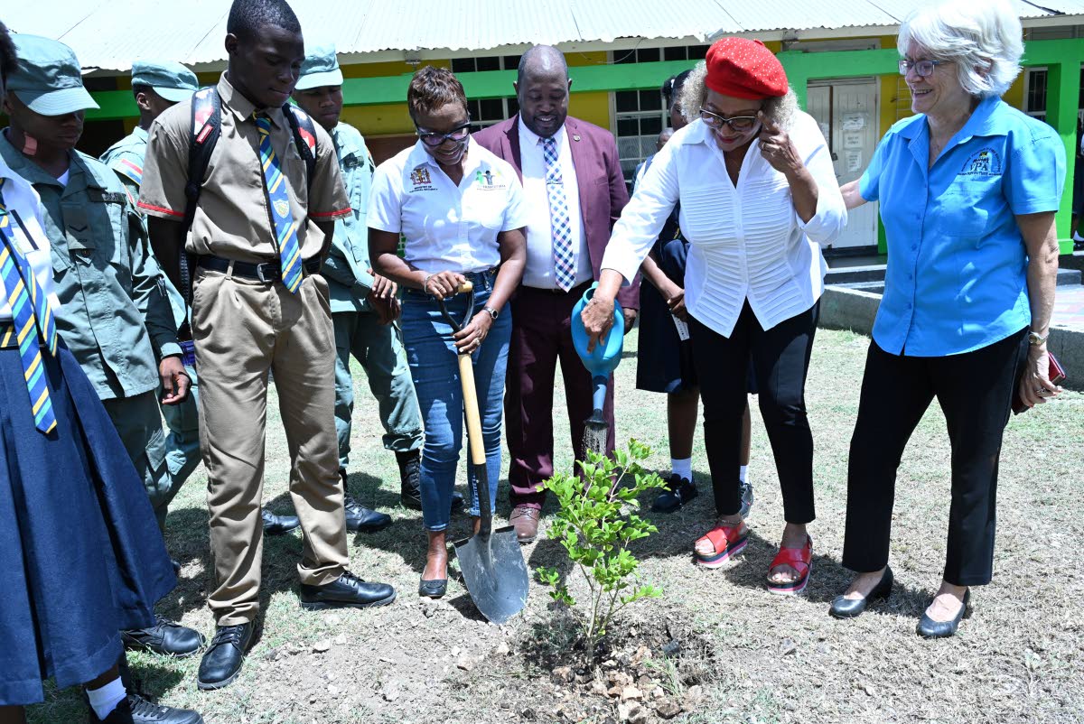 Singer Marcia Griffiths (second right), past student of Kingston High School, plants a ‘Peace Tree’ with Juliet Cuthbert-Flynn (centre), minister of state in the Ministry of National Security. Looking on are: Principal of Kingston High Jermaine Loutin
