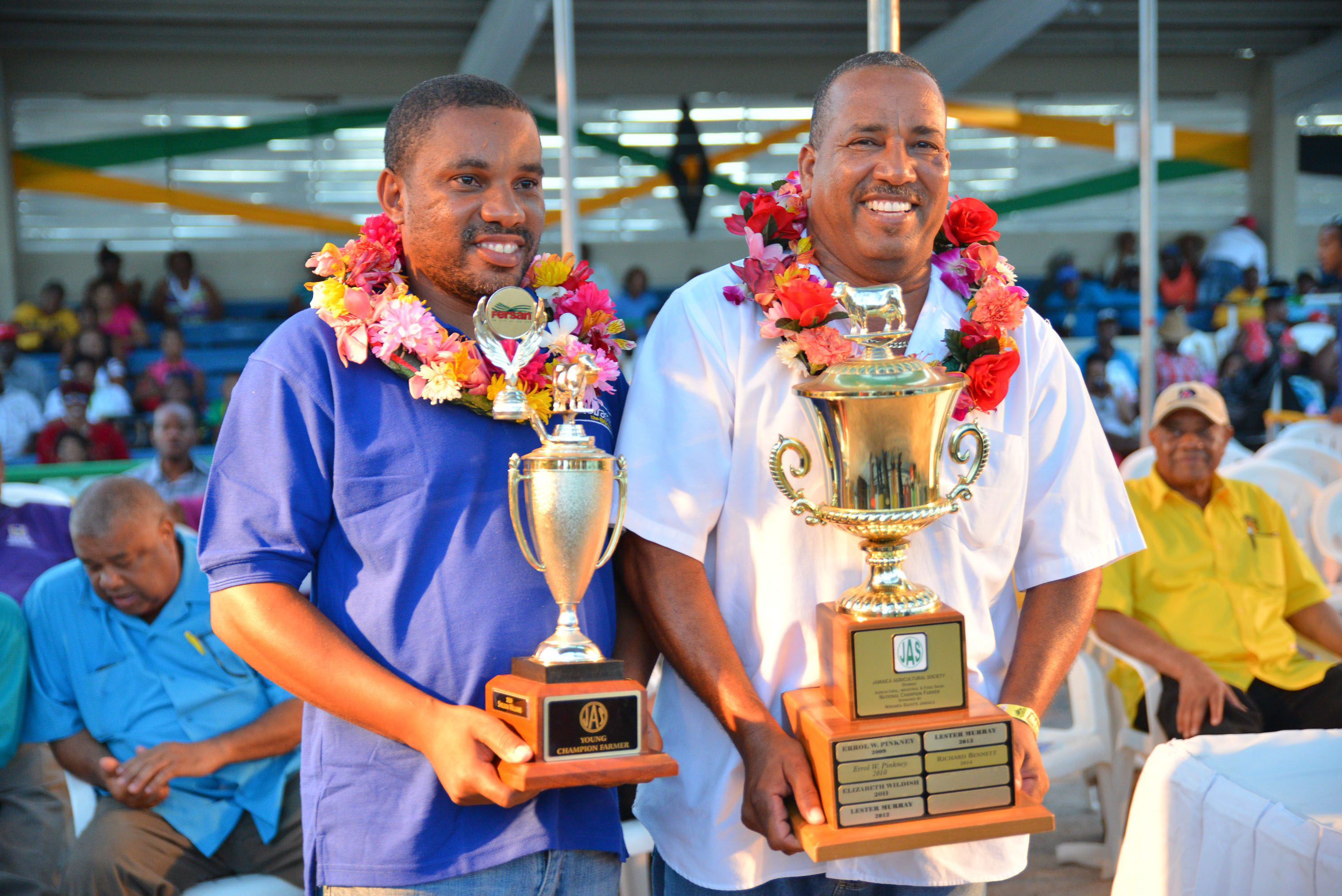Sheldon Williams (left), Young Champion Farmer for 2014, and Richard Bennett, National Champion Farmer 2014, pose with their trophies after last year’s presentation ceremony.