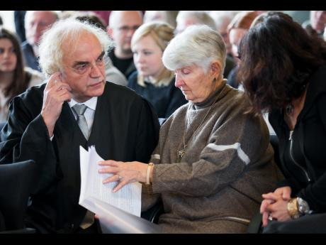 APThomas Walther (left), legal representative of the accessory prosecution, Auschwitz survivor Hedy Bohm (centre), and her daughter Vicky wait in the courtroom in Detmold, Germany, yesterday. Reinhold Hanning is accused of 170,000 counts of accessory to murder on allegations he served in Auschwitz in 1943 and 1944.