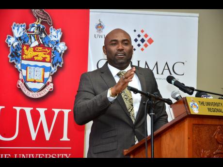 Dr Andrew Wheatley, the minister of science, energy and technology speaks at the National Conference on Cyber Security, at the Regional Headquarters of the University of the West Indies, Mona Campus on Tuesday.