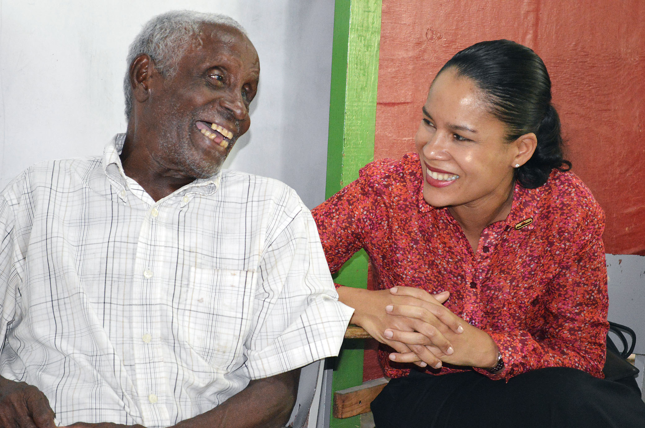 Gail Moss Solomon (right), senior legal counsel at Grace, shares a laugh with a senior citizen at the central Kingston outreach.