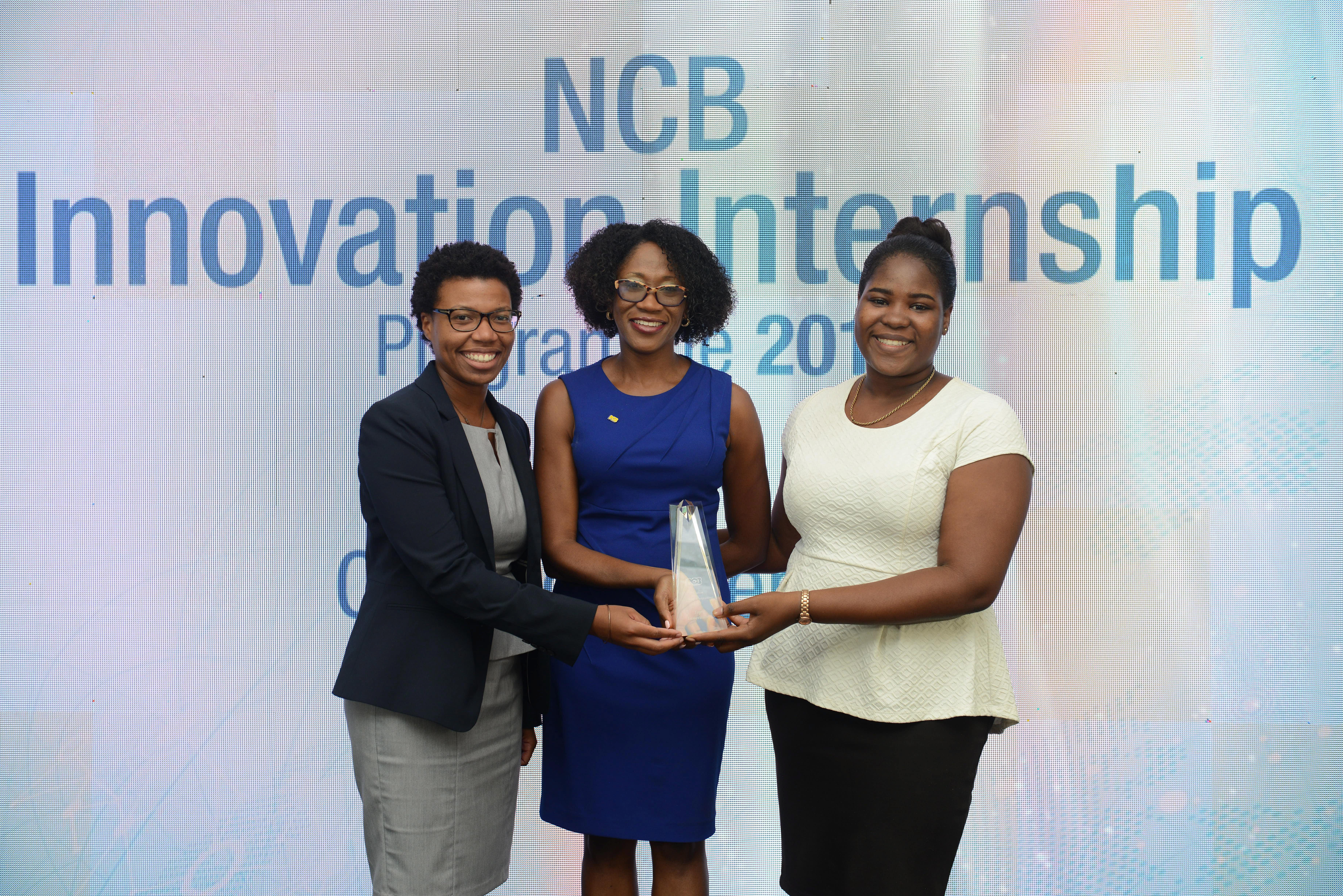 Top 2017 NCB Innovators Stacey-Ann Pearson (left) and Kendra Lee (right) pose with Nadeen Matthews, NCB Chief Digital & Marketing Officer, showcasing the champion trophy. The two young ladies tied for the top position after four weeks of intense ideation sessions, team challenges and presentations during the second annual NCB Innovation Internship. The duo each walked away with a trophy and US$500.