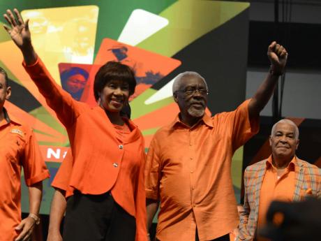 Former PNP presidents Portia Simpson Miller and PJ Patterson raise their fists on the stage of the party's annual conference - Ian Allen photo