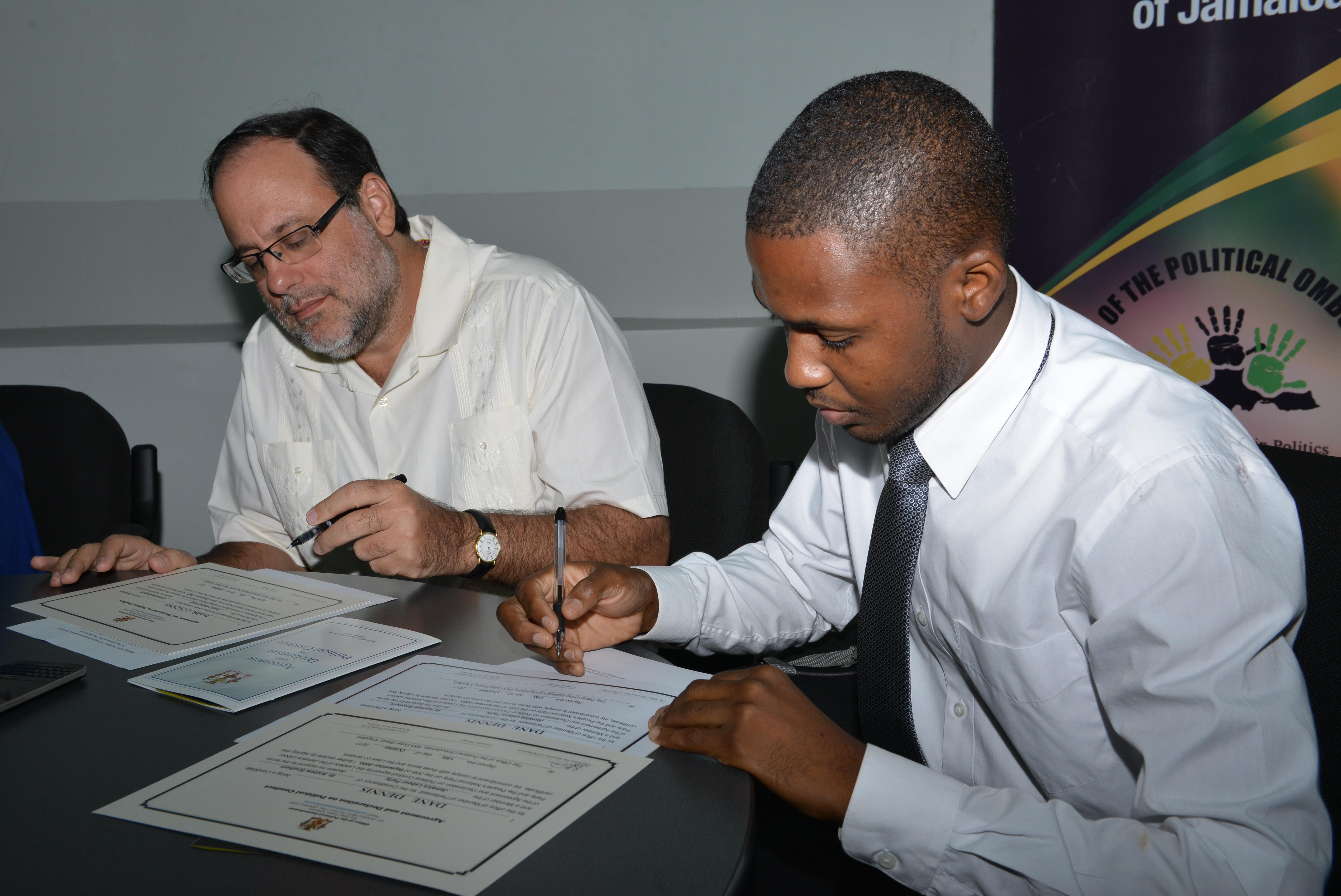 PNP’s General Secretary Julian Robinson, and deputy mayor for Kingston and St Andrew, Winston Ennis, of the JLP, pledged their parties’ commitment to upholding the political code of conduct.