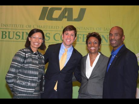 (From left) Allison Peart, chairman of the 2017, ICAJ Business Conference Planning Committee; Pip Decker, senior vice president, BMR Energy; Ava Tomlin, regional director, Jamaica, BMR Energy; and Raymond Campbell, president, ICAJ, share a light moment at the ICAJ Business Conference which was held on October 6, 2017 at The Jamaica Pegasus hotel in New Kingston.