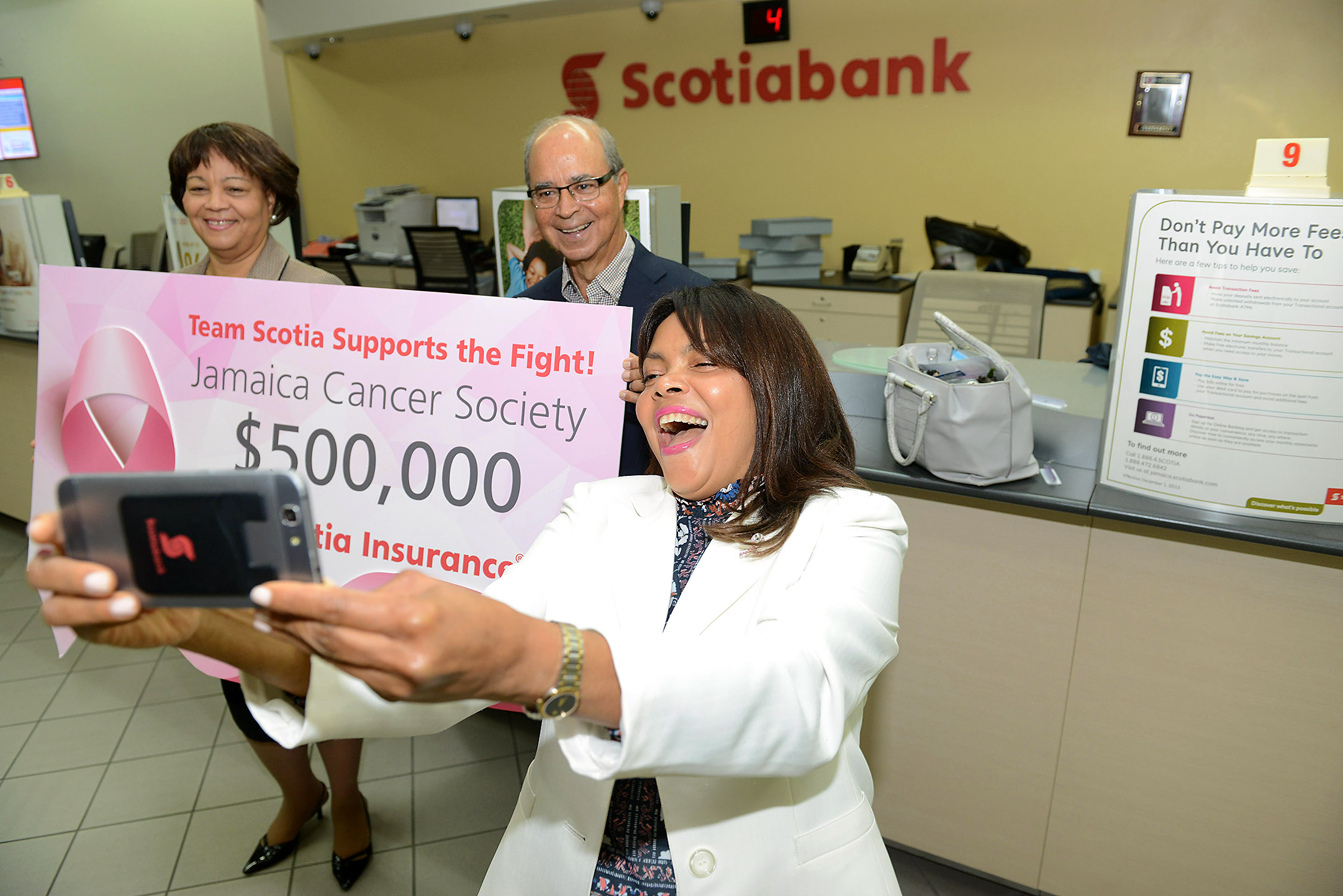 Yulit Gordon, (right) Executive Director of the Jamaica Cancer Society, takes a selfie after being presented with a $500,000 cheque by Ruth Campbell (left) of Scotia Insurance. The money will be used towards the fight against breast cancer. Also in the photo is Vice Chairman of the cancer society, Michael Fraser.