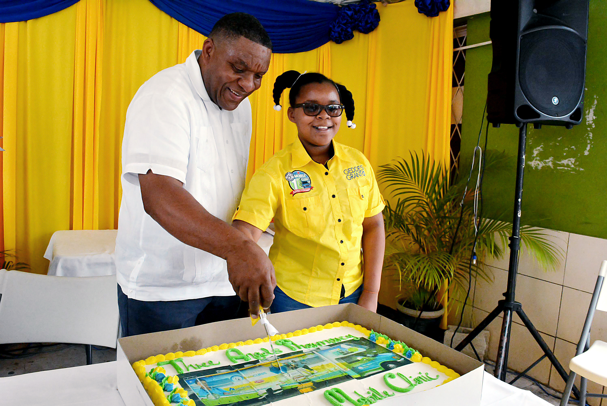 Rohan McNellie, owner of Three Angels Pharmacy, cuts the anniversary cake with daughter, Ronice.