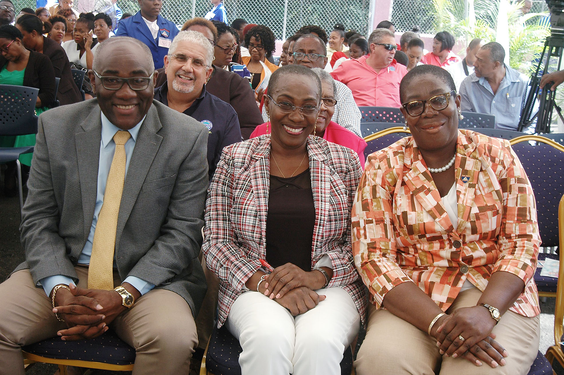From left: Chairman of Sam Sharpe Teachers’ College (SSTC) board of governors, Norman Reid; past student, now professor at Washington University, Dr Grethel Bradford; and current acting principal of SSTC, Dr Lorna Gow-Morrison, have good reason to smile as they and the many guests await the official opening of the Sam Sharpe Diagnostic and Early Childhood Intervention Centre on Tuesday, October 23.