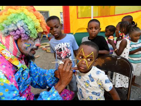 A clown painting the face of children at the Faith United Church of God 10th Annual Christmas Treat, put on by the Gift of Love Foundation, Ara Party Rentals and Dr Alfred Dawes, at the church located in the Mandela Terrace Community, St Andrew, on Sunday.